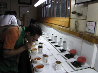 So here we are at Lovers Leap learning how to do tea tasting the factory way. It is very similar to how we do it when we receive samples only these guys do it everyday. Every single production run/batch gets tasted for consistant standard quality in whatever type of tea they are producing. It is truly an artform.